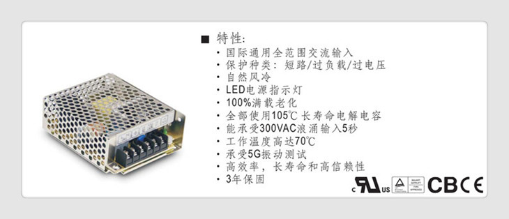 高可靠开关电源机型, 可承受5G震动与70°C高工作环温,全机使用105°C高寿命电解电容,可承受300VAC突波输入达5秒,适合使用于较严苛的工作环境