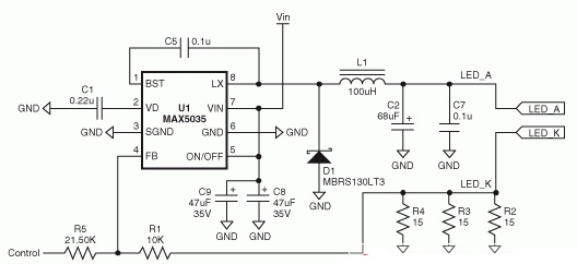 图1通过调节控制电压(0V至3.9V),MAX5035 LED电流驱动器能够在LED_A和LED_K端产生近似350mA至0mA的输出电流。