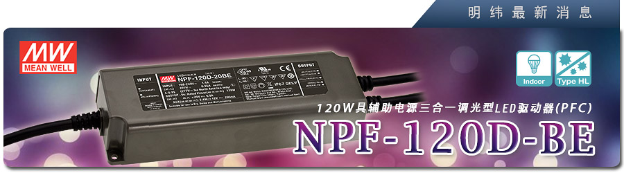 NPF-120D-BE 系列 (具辅助电源三合一调光型LED驱动器 (PFC)