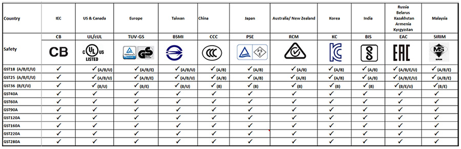 除原已取得的TUV(欧盟)、UL/CUL(北美)、CCC(中国)、BSMI(台湾)、PSE(日本)、RCM(澳洲)等国家或地区认证外,galaxy银河亦于2016年10月完成追加申请KC(韩国)、BIS(印度)、EAC(俄罗斯、白俄罗斯、哈萨克斯坦、亚美尼亚、吉尔吉斯)、SIRIM(马来西亚[注1])等4种认证。GST全家族现在已拥有超过10种的安规认证,可完整涵盖全球超过90%以上国家或地区的认证需求,可替您的终端系统节省庞大的安规费用并减少繁琐的安规认证程序。若您的终端产品目前仍在苦恼找不到一个具备环球认证的适配器电源来搭配营销全球,galaxy银河的GST家族产品将会是您的最佳选择!